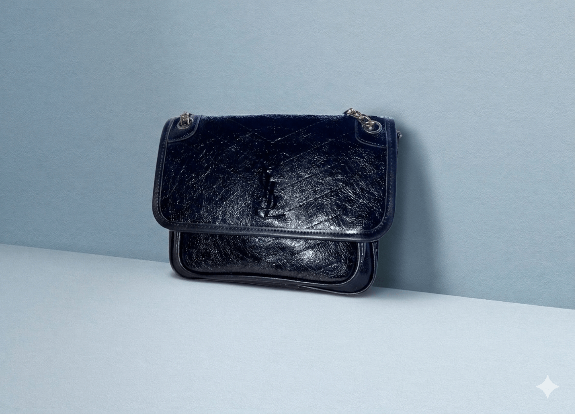 The Niki Shoulder Bag is designed for those who appreciate a vintage yet rebellious aesthetic. Crafted from premium crinkled leather with a glossy finish, this bag features a unique “distressed” look that only gets better with time. The tonal black-on-black YSL monogram on the front flap offers a subtle, sophisticated branding, while the chunky chain-link strap allows you to switch between a long crossbody or a doubled-up shoulder carry. It is the ultimate “cool-girl” bag that adds effortless style to both day and night looks.